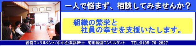 | ◆電話、電子メール、fax等でご連絡ください。 経営革新:経営革新の知事承認、経営システム構築・改善、売上高や利益のアップ、5S(整理・整頓・清掃・清潔・躾)の構築等 創 業:起業化・創業、経営計画書の策定、事業計画の策定、会社設立、販売システムの提案等 経営強化:後継者育成、管理職育成、社員人材育成、経営安定化、製品やサービスの開発等 その他 :人事・労務管理の改善、HACCP対策、障害者や高齢者対策、各種診断、顧問、 セミナー等 |